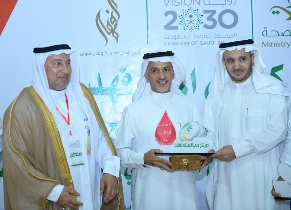 دشن مركز حي الملك فهد التابع لجمعية البر بالأحساء بالشراكة مع صحة الأحساء حملة التبرع بالدم تحت شعار ”دمك قطرات ندى“، في مقر نادي الحي الفهد بمدرسة وادي طوى الإبتدائية بحي الملك فهد بمدينة الهفوف، اليوم الخميس.
