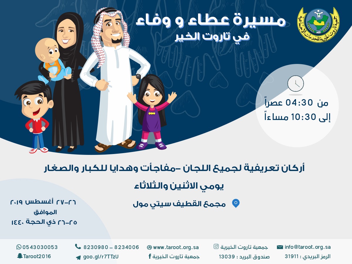 وتتضمن الفعالية أركان تعريفية للجان جمعية تاروت الخيرية ومفاجأت وهدايا للكبار والصغار بالإضافة إلى ركن خاص للأطفال.