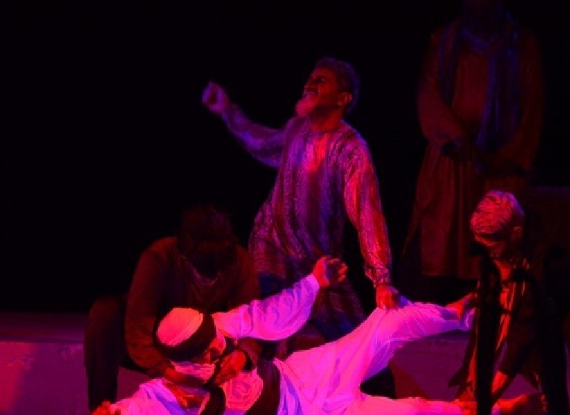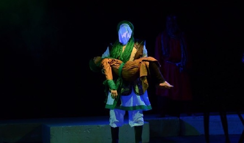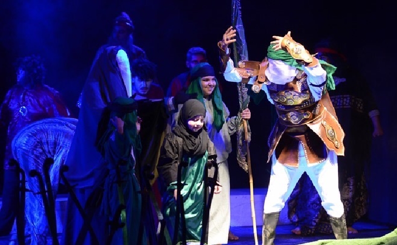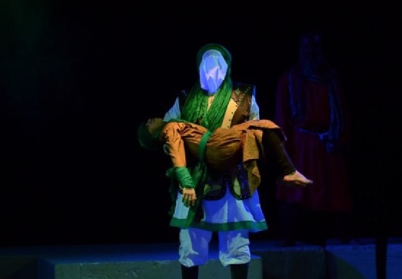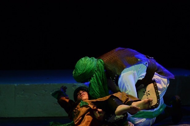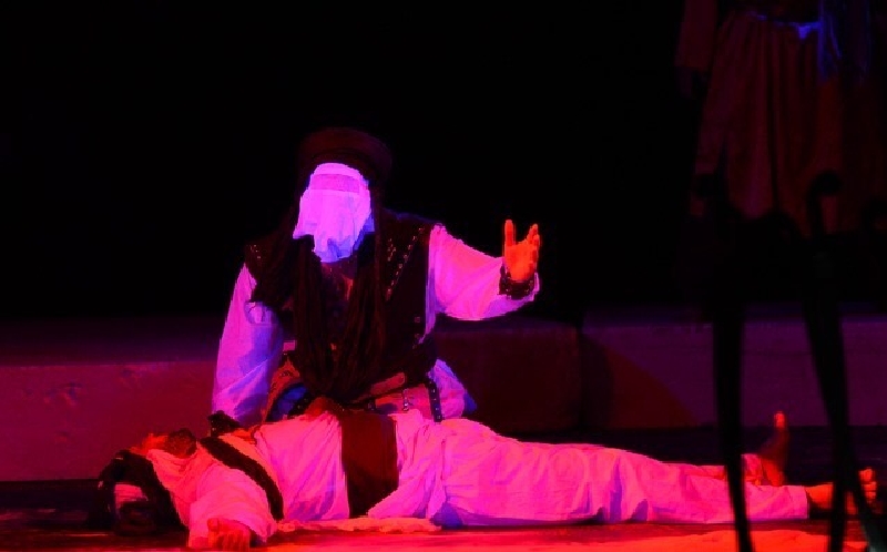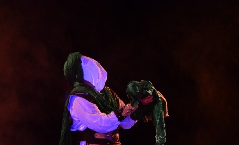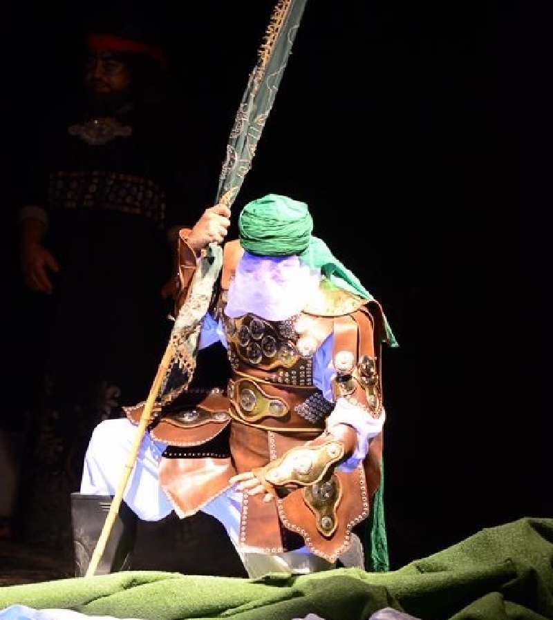 وأضاف أنه لم يوظف السيوف في هذا العرض المسرحي عدا سيف شمر بن ذي الجوشن، مستخدما مفارقات وعكس الادوار الحقيقية حيث جعل الإمام الحسين قاتلا للشمر لا العكس.