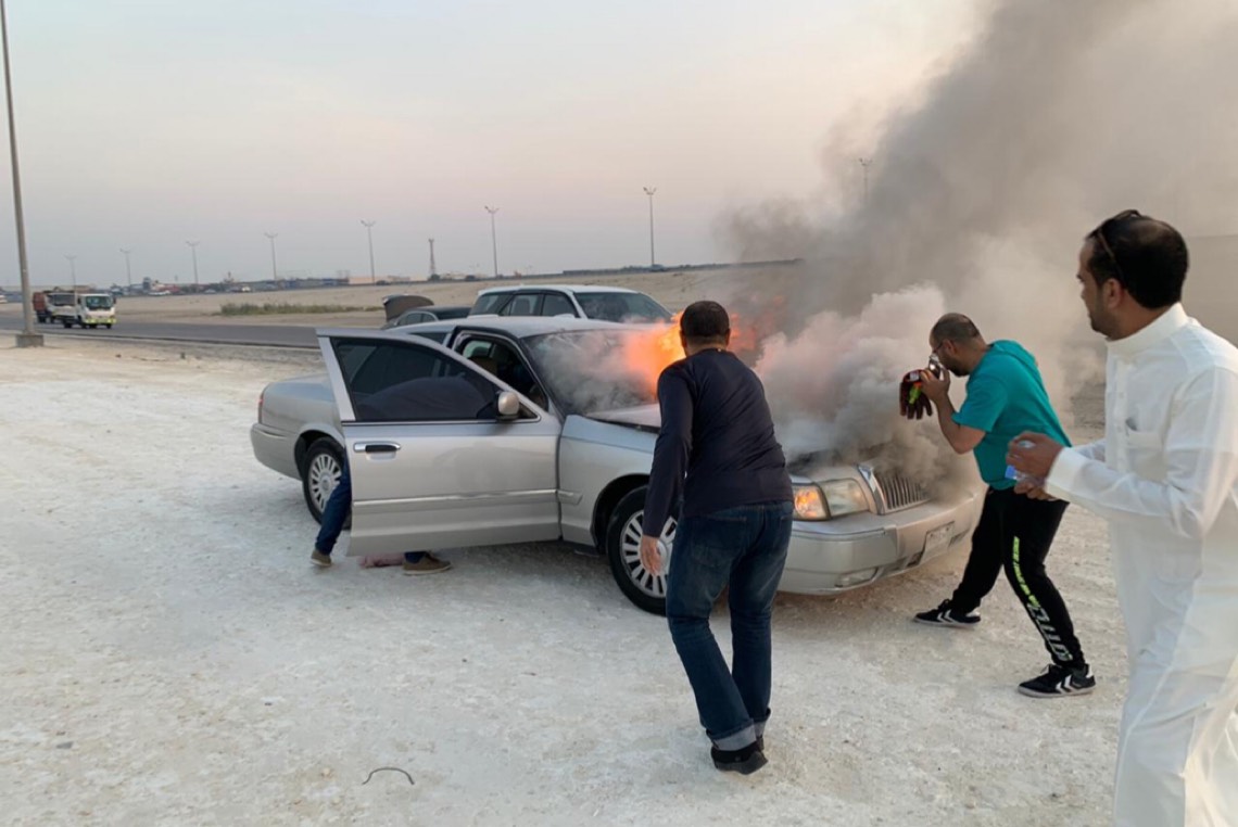 وكان الشاب يقود سيارته وفوجئ بنشوب حريق بمحركها، فقام على الفور بإيقافها والنزول ومحاولة السيطرة على النيران بمساعدة عدد من المواطنين، قبل وصول رجال الدفاع المدني.