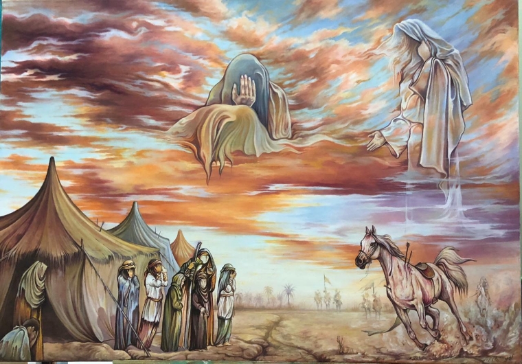 وأشار إلى ظروف رسم لوحته الثانية وتأثره بمنظر البكاء ”لمخرج واقعة الطف بلباسه الاسود وبكائه وهو يحاول أن يجسد الواقعة داخل المعركه للجمهور“، فأخذته اللوحة إلى مقولة ”لأبكين عليك بدل الدموع دما“.