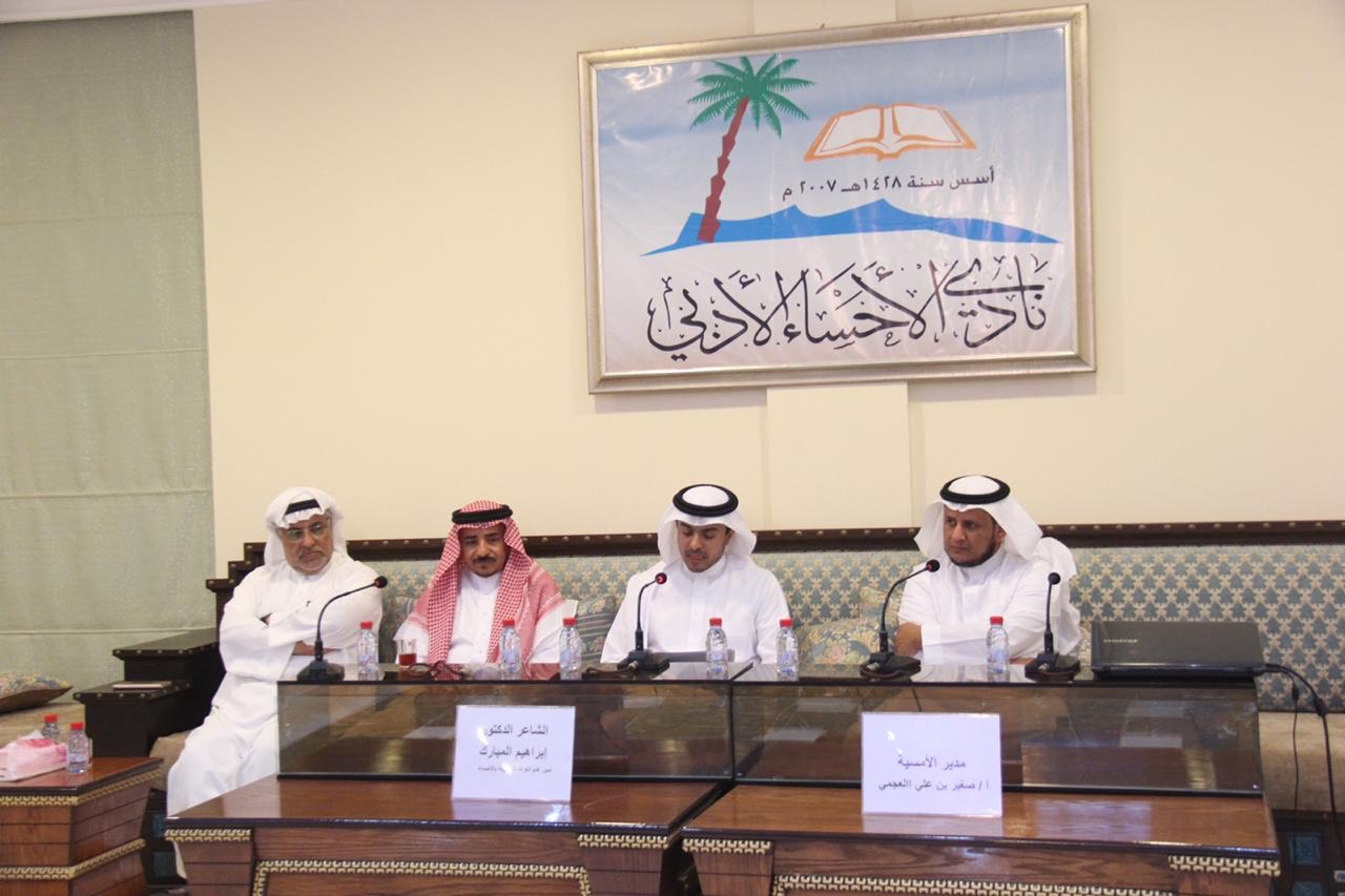 استضاف نادي الأحساء الأدبي الشاعر الدكتور إبراهيم آل الشيخ مبارك أمين عام غرفة الأحساء في أمسية شعرية بإدارة منسق الفعاليات والبرامج بالنادي صغير العجمي.