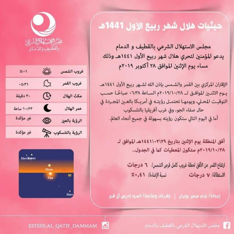 دعا مجلس الاستهلال الشرعي بالقطيف والدمام أفراد المجتمع لتحري هلال شهر ربيع الأول مساء يوم الأثنين.