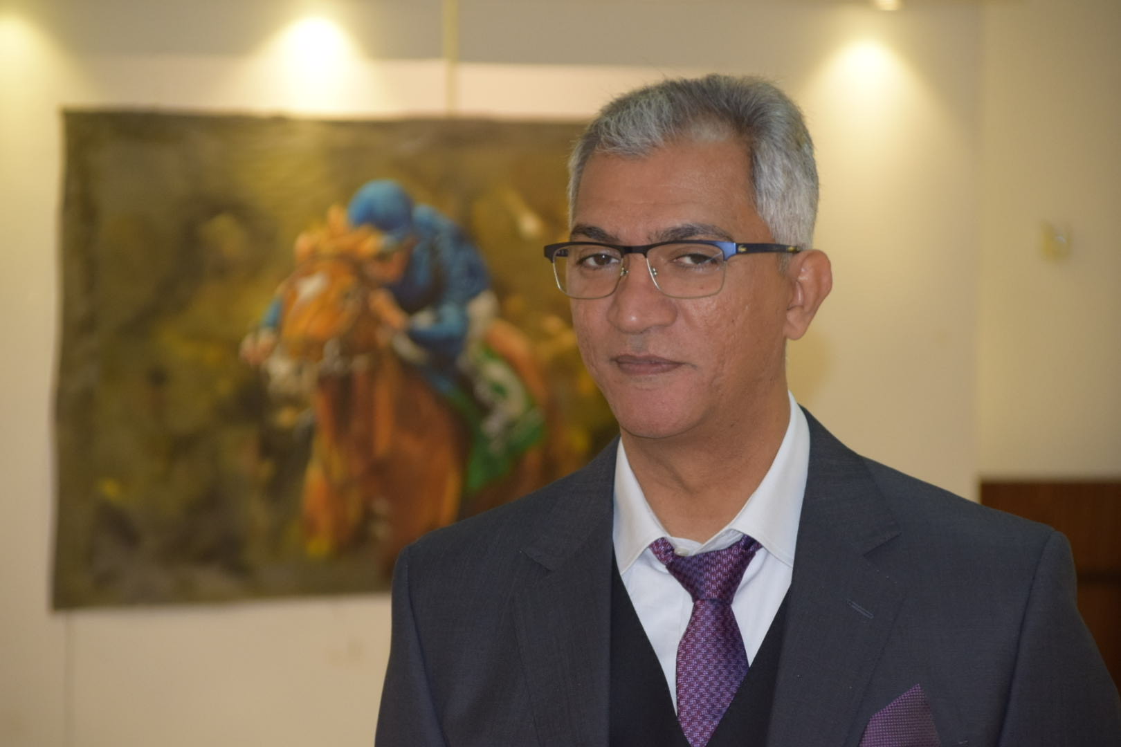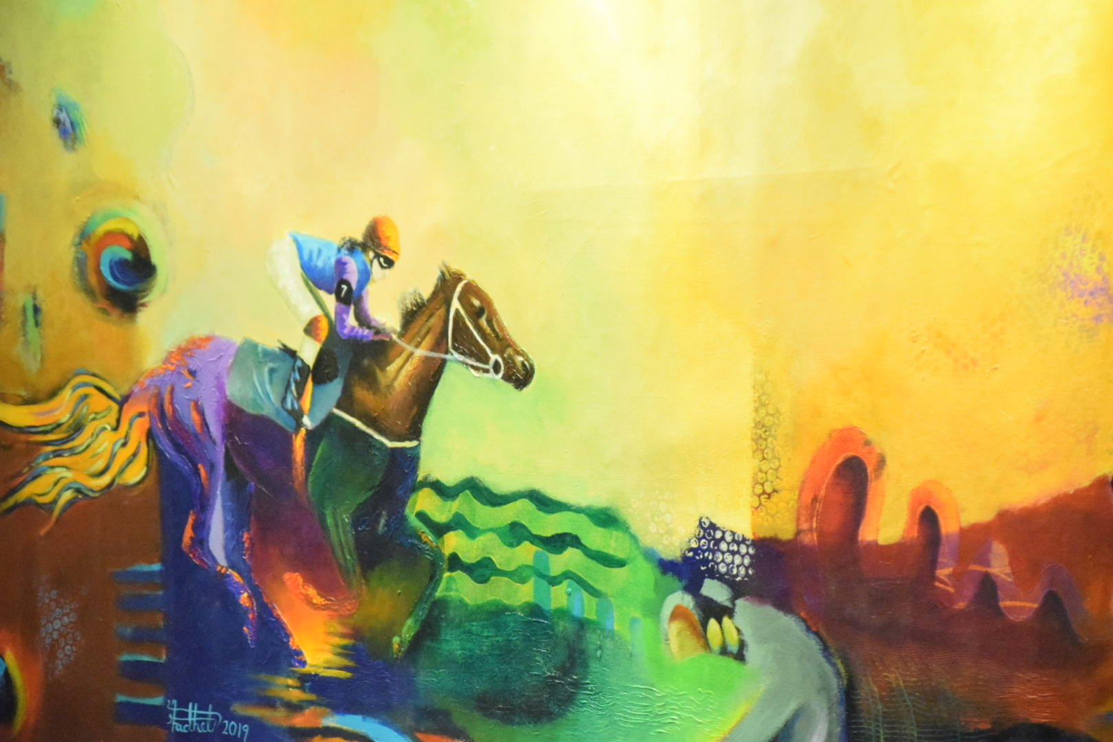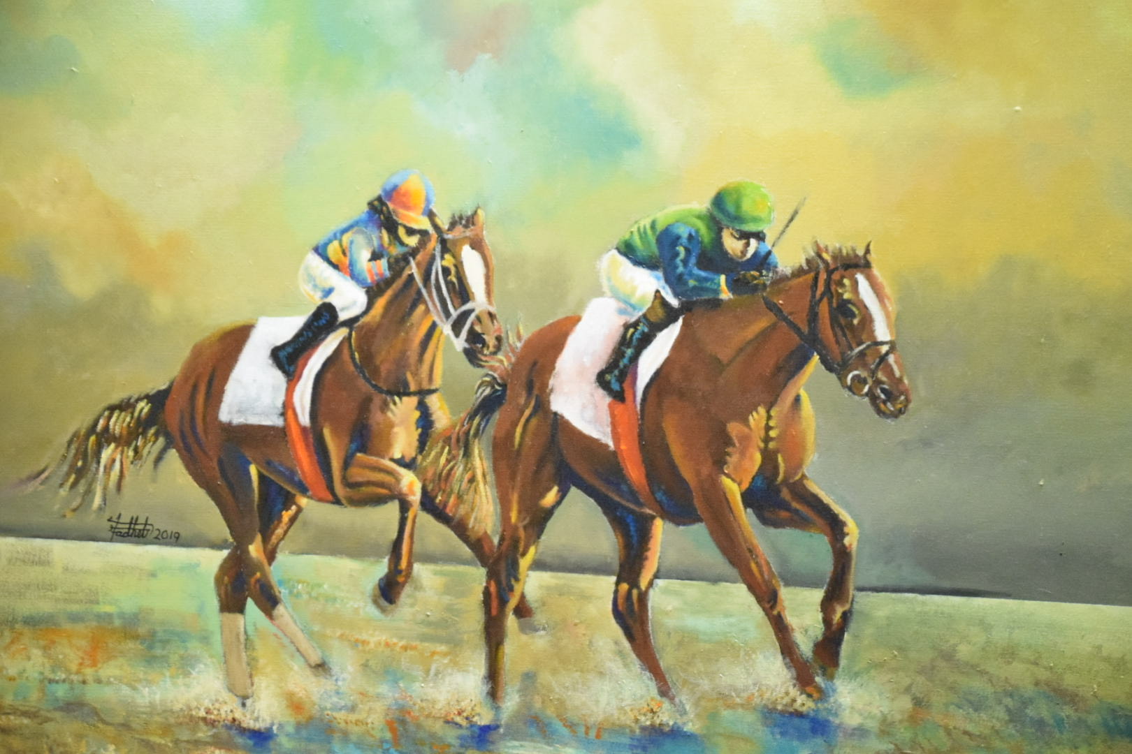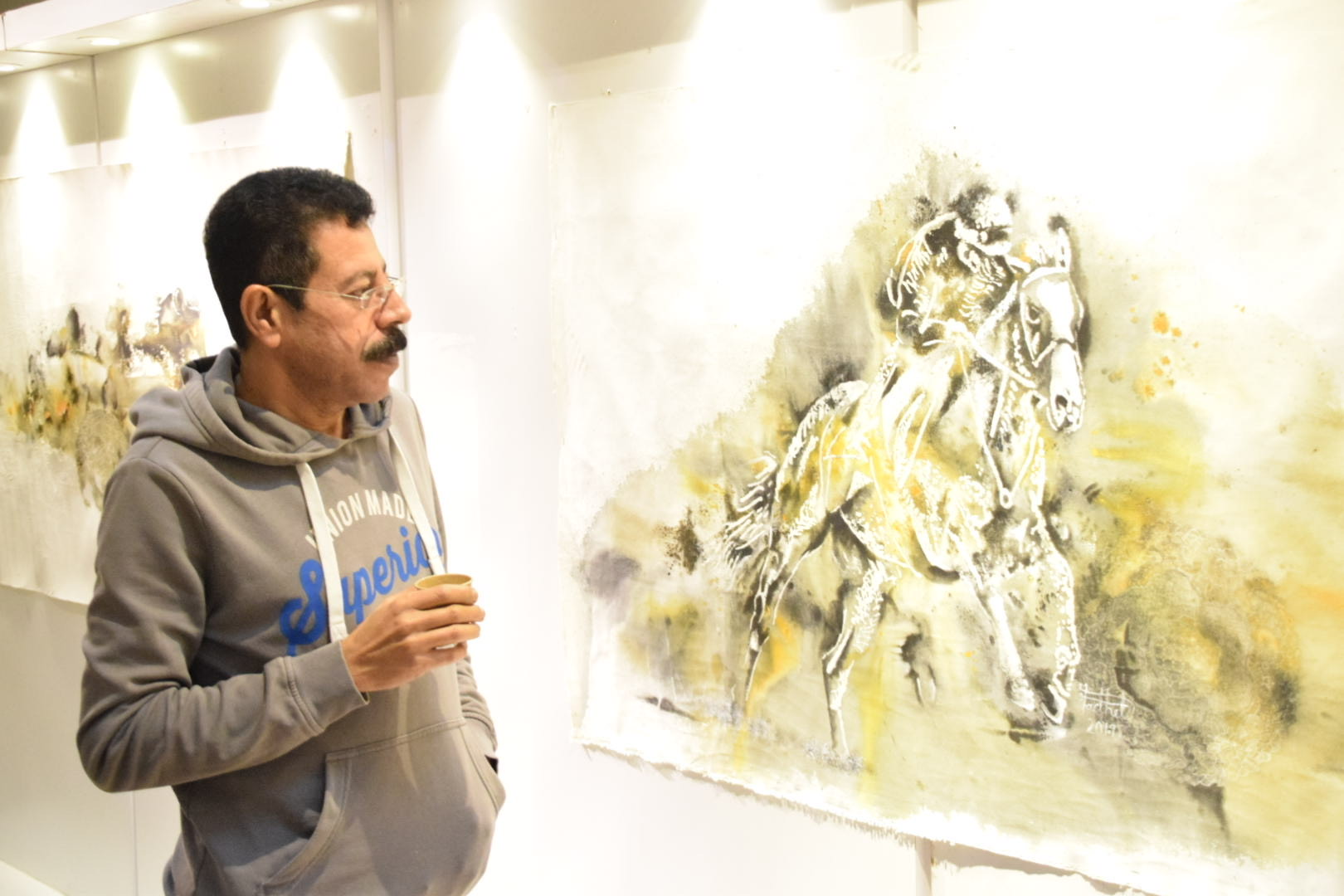 واحتوى المعرض على 25 لوحة للفنان بوشومي من الحجم الكبير وموضوعها ”بين الخيل.. وخط النهاية“.