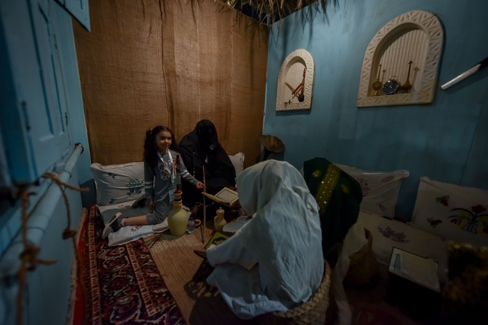 بين جدران البيت القطيفي ورائحة التراث الأصيل تجمهر زوار مهرجان البراحة الثاني حول الطفلة زين المشعل التي حملت اسم أصغر راوية لتراث القطيف.
