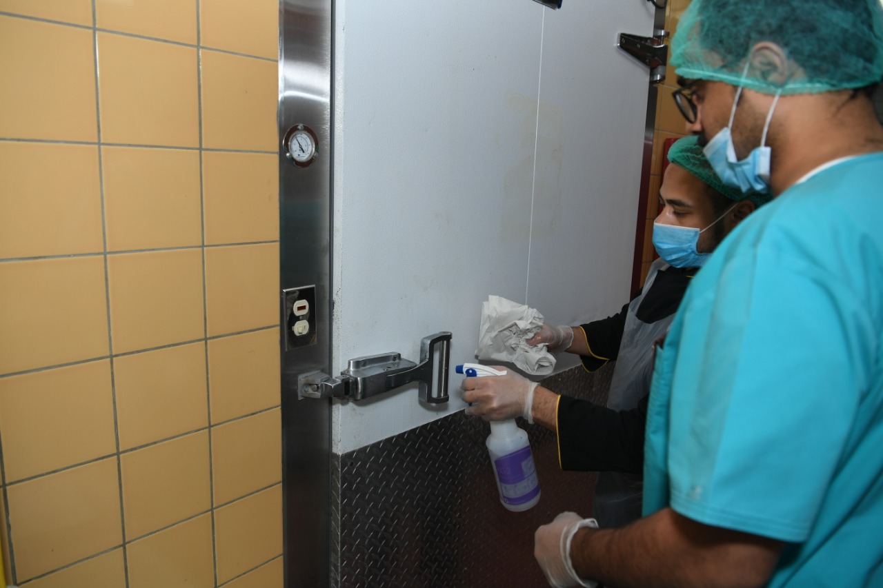 وأضاف وتوفير المعقمات لليدين في أماكن متفرقة في المطعم، كذلك إلزام جميع العاملين ومقدمين الطعام بلبس القفازات والكمامات الطبية، وكذلك تنظيف الطاولات والكراسي بالمعقمات بعد كل استخدام، وتنظيف الأرضيات والأسطح بشكل مستمر، وتوفير مواد التعقيم للمستفيدين.