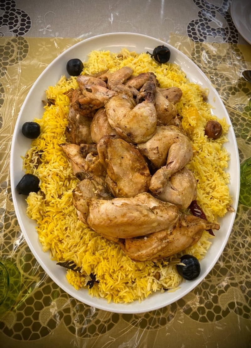 وذكر أنه يشارك عائلته في تجهيز وطبخ عدة أطباق منها المندي والكبسة وصالونة الخضار.