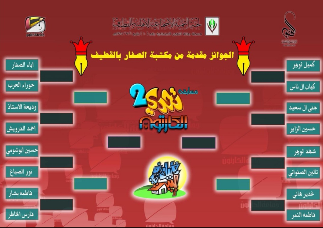 أعلنت جماعة الكارتون التابعة للجنة التنمية الاجتماعية الأهلية بالقطيف عن انطلاق النسخة الثانية لـ ”مسابقة تحدي الكارتون“ بنظام خروج المغلوب.