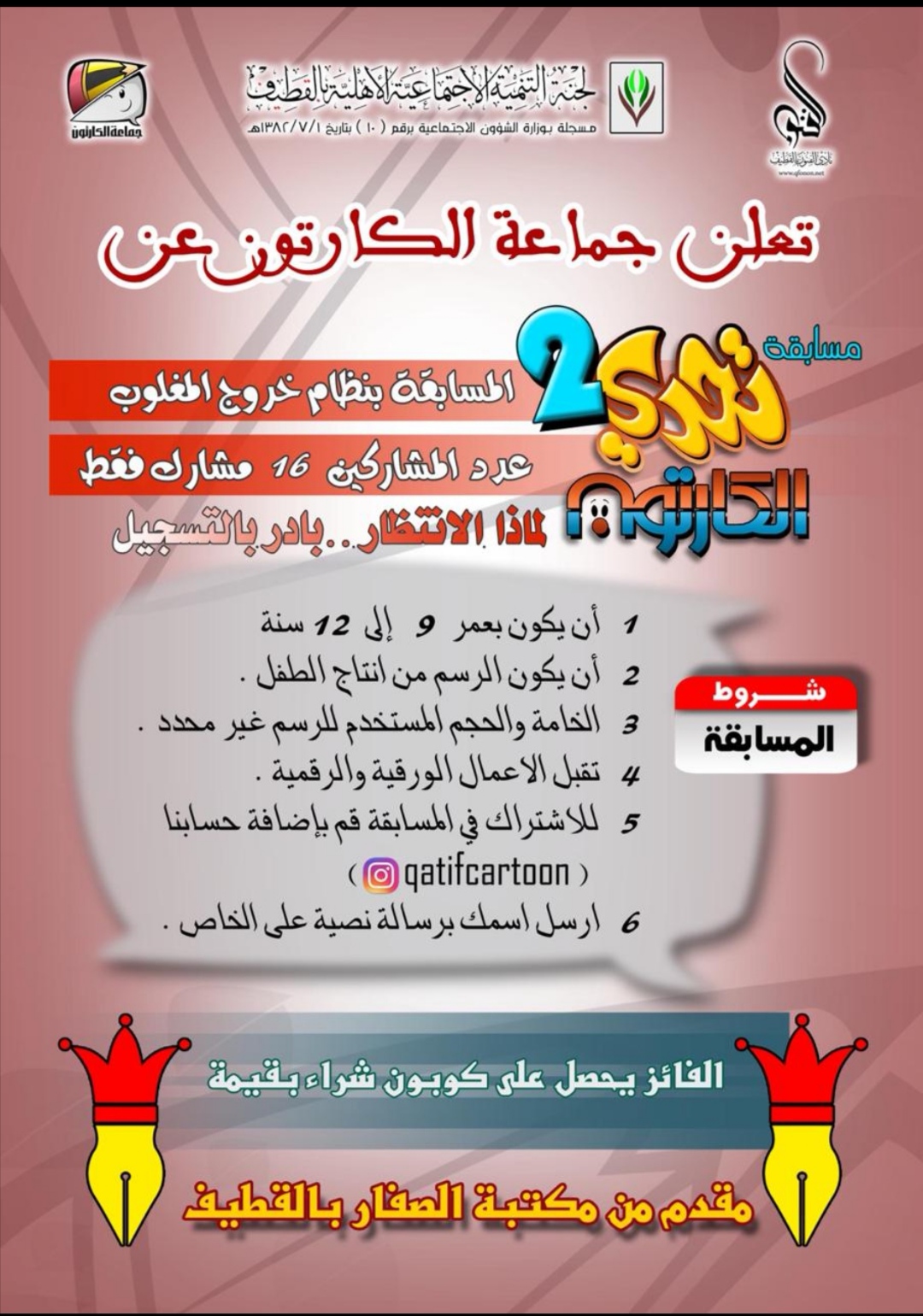 ونوهت بأن الخامة والحجم المستخدم للرسم غير محدد ولا تقبل الأعمال الورقية والرقمية، موضحة بأنه وللاشتراك في المسابقة إضافة الحساب «qatifcartoon» وإرسال الاسم برسالة نصية على الخاص.