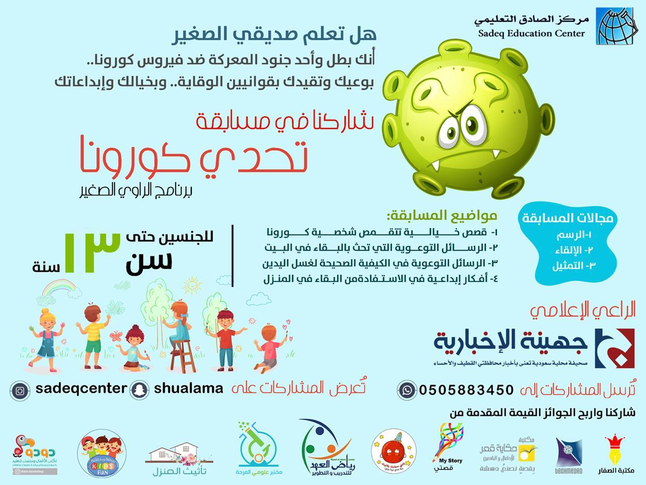 ينظم برنامج الراوي الصغير التابع لمركز الصادق التعليمي مُسابقة ”تحدّي كورونا“ للأطفال.