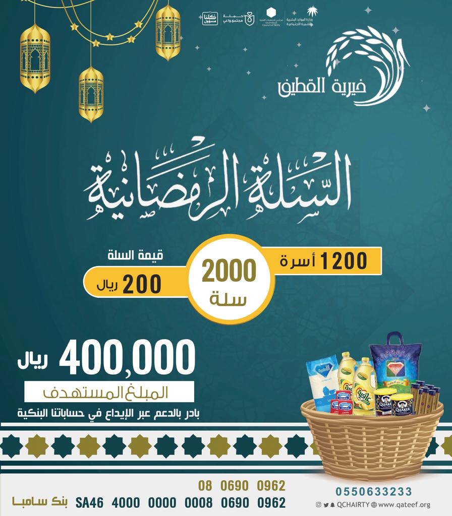أطلقت جمعية القطيف الخيرية المشروع السنوي ”السلة الرمضانية“ والذي يهدف إلى مساعدة الأيتام والأسر المحتاجة في تأمين المواد التموينية في شهر رمضان المبارك، وتبلغ قيمة السلة 200 ريال.