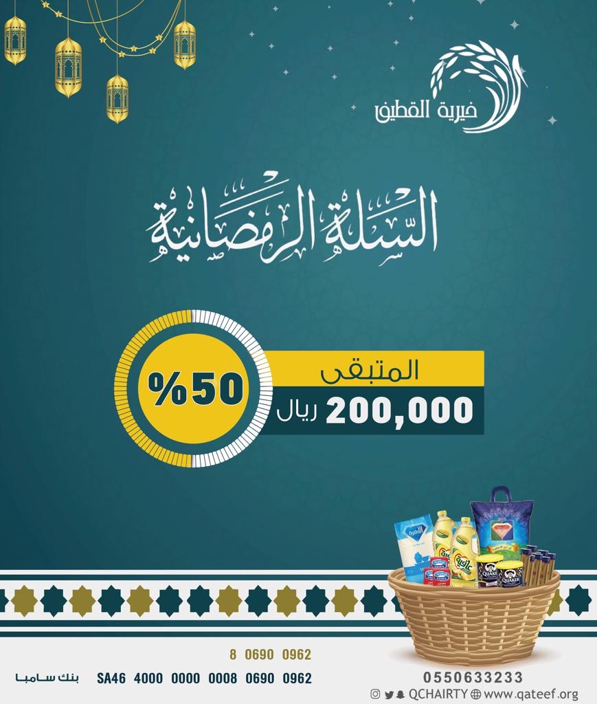 تمكنت جمعية القطيف الخيرية منذ انطلاق مشروعها السنوي ”السلة الرمضانية“ من جمع 50% من المبلغ المستهدف، بعدأن بلغ مجموع التبرعات خلال 3 أيام 200 ألف ريال من أصحاب الأيادي البيضاء والمحسنين، وذلك من أصل 400 ألف ريال.