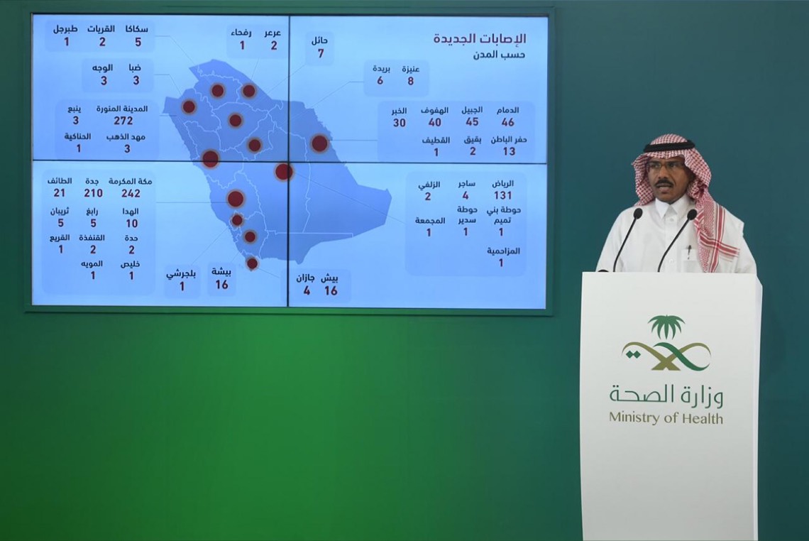 وتوزعت حالات الإصابة الجديدة بين مدن المملكة كالتالي: المدينة المنورة ”272“، مكة المكرمة ”242“، جدة ”210“، الرياض ”131“، الدمام ”46“، الجبيل ”45“، الهفوف ”40“، الخبر ”30“، الطائف ”21“، بيشة ”16“، بيش ”16“، حفر الباطن ”13“، الهدا ”10“، عنيزة ”8“، حائل ”7“، بريدة ”6“، رابغ ”5“، ثريبان ”5“، سكاكا ”5“، جازان ”4“، ساجر ”4“، ينبع ”3“، مهد الذهب ”3“، الوجه ”3“، ضبا ”3“، بقيق ”2“، حدة ”2“، القنفذة ”2“، القريات ”2“، عرعر ”2“، الزلفي ”2“، القطيف ”1“، الحناكية ”1“، المويه ”1“، القريع ”1“، بلجرشي ”1“، خليص ”1“، طبرجل ”1“، رفحاء ”1“، المجمعة ”1“، حوطة بني تميم ”1“، حوطة سدير ”1“، المزاحمية ”1“.