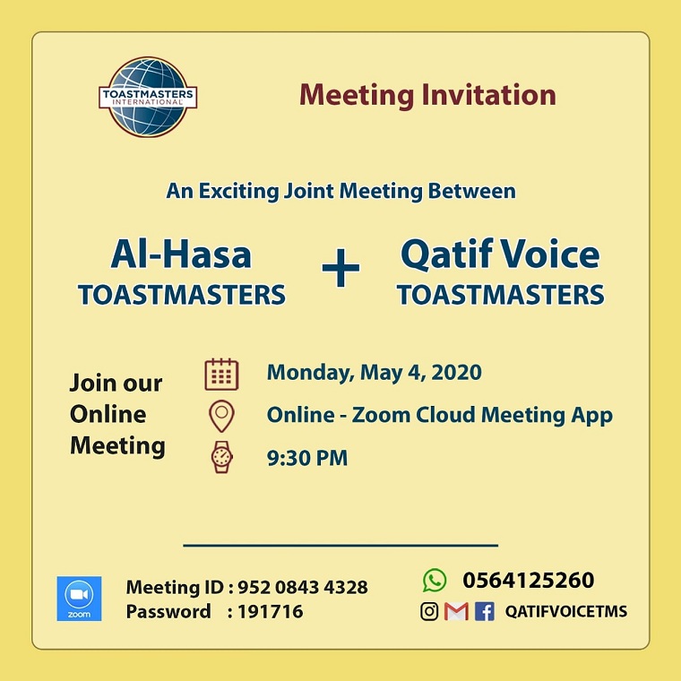 يقيم ناديا الأحساء وصوت القطيف لقاء توستماسترز مشترك مساء الاثنين حيث يشارك أعضاء الناديين في هذا اللقاء بخطب معدة وخطب إرتجالية باللغة الإنجليزية.
