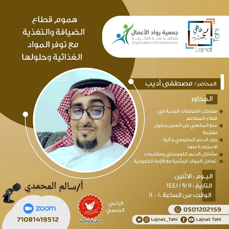 تنظم لجنة طاهي محاضرة بعنوان «هموم قطاع الضيافة والتغذية مع توفر المواد الغذائية وحلولها» والتي يقدمها المحاضر مصطفى أديب ويحاوره سالم المحمدي وذلك عبر برنامج زووم.