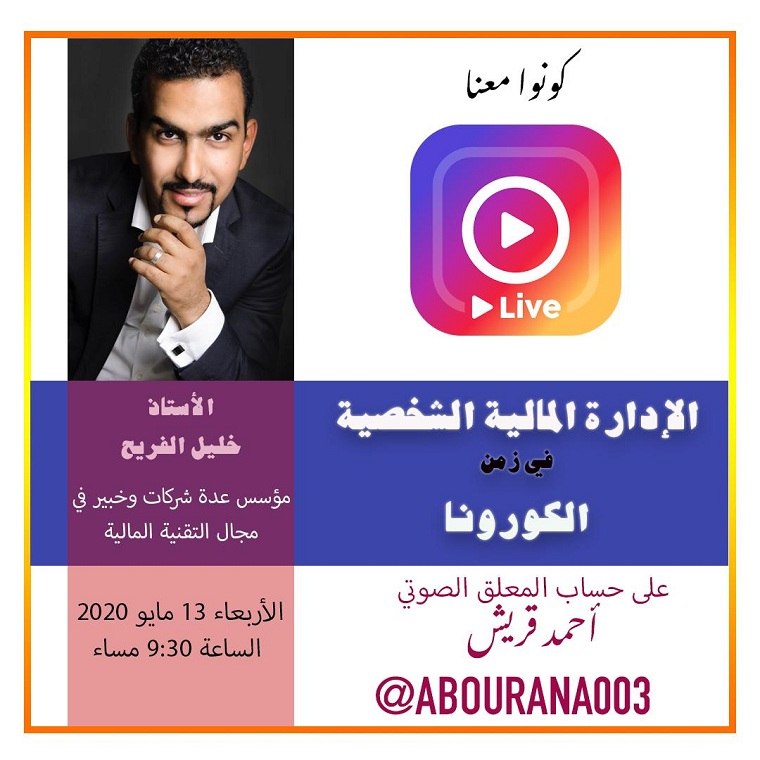 يتحدث خليل الفريح والذي يعد مؤسسا لعدة شركات وخبير في مجال التقنية المالية حول «الإدارة المالية الشخصية في زمن الكورونا» يوم الأربعاء على حساب المعلق الصوتي أحمد قريش.