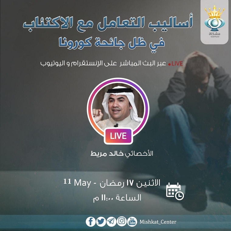 ينظم مركز مشكاة للتنمية البشرية محاضرة «أساليب التعامل مع الاكتئاب في ظل جائحة كورونا» اليوم الأثنين مع الأخصائي خالد مريط عبر البث المباشر على الانستقرام واليوتيوب.