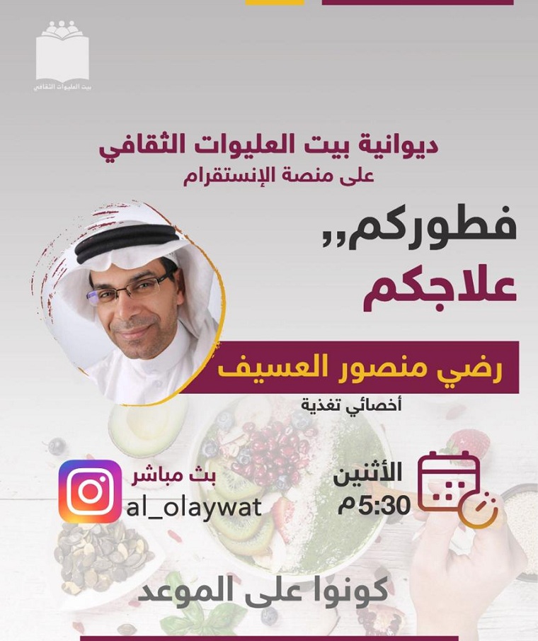 تنظم ديوانية بيت العليوات الثقافي على منصة الانستقرام محاضرة «فطوركم.. علاجكم» مع أخصائي التغذية رضي العسيف.