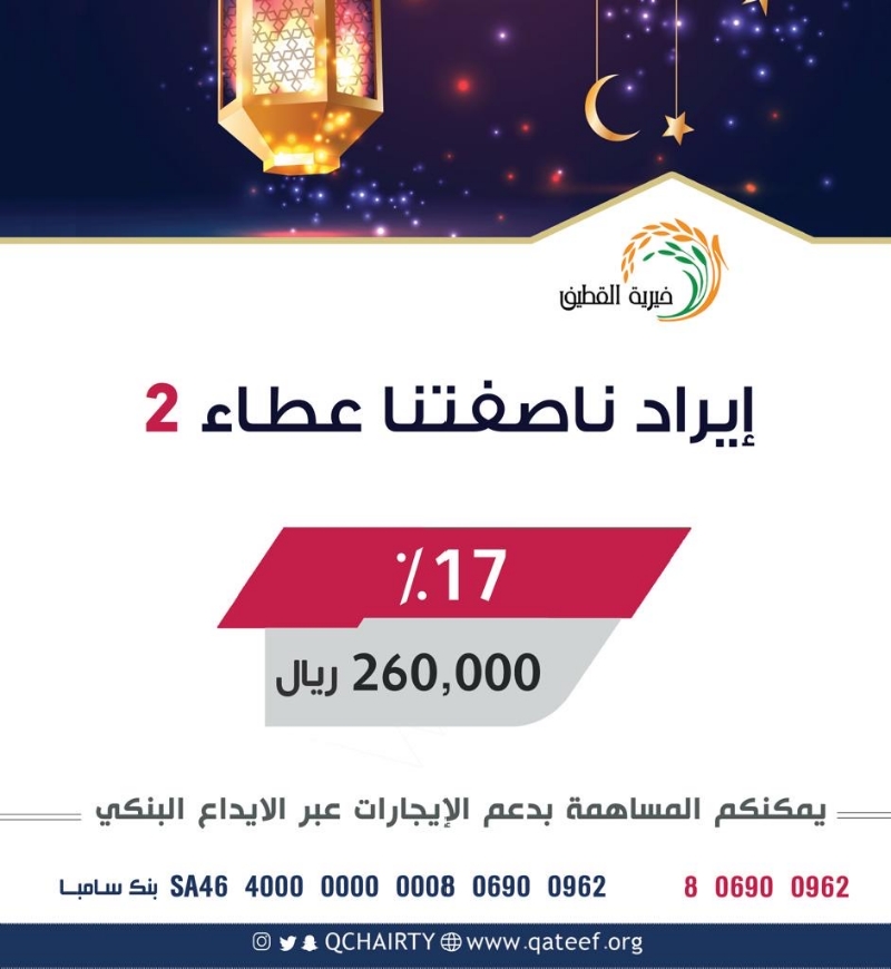 استقبلت جمعية القطيف الخيرية منذ انطلاق مبادرتها“ناصفتنا عطاء2" لدعم إيجار مساكن الأيتام والفقراء في 12رمضان، 17% من المبلغ المستهدف، بعد أن بلغت التبرعات 260 ألف ريال قدمها أهل الخير، وذلك من أصل مليون و500 ألفًا.