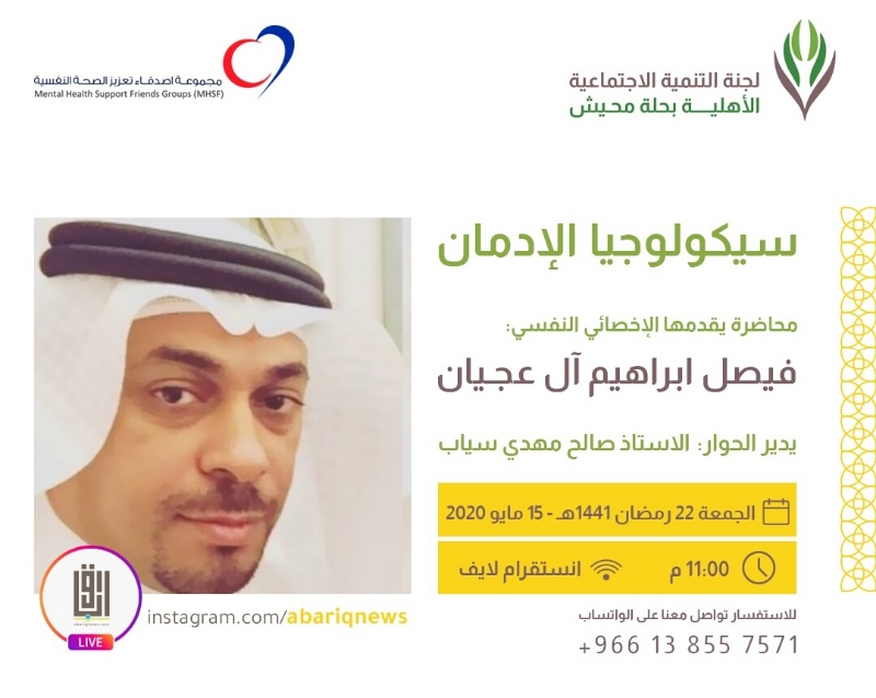 تنظم لجنة التنمية الاجتماعية الأهلية بحلة محيش بالتعاون مع مجموعة أصدقاء تعزيز الصحة النفسية بالقطيف محاضرة ”سيكولوجيا الإدمان“ عبر الفضاء الإلكتروني.