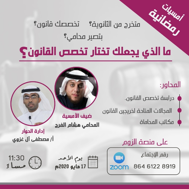 يحاور مصطفى آل غزوي في أمسيات رمضانية المحامي هشام الفرج حول ”دراسة تخصص القانون“ على منصة زوم في الفضاء الإلكتروني مساء الأحد.