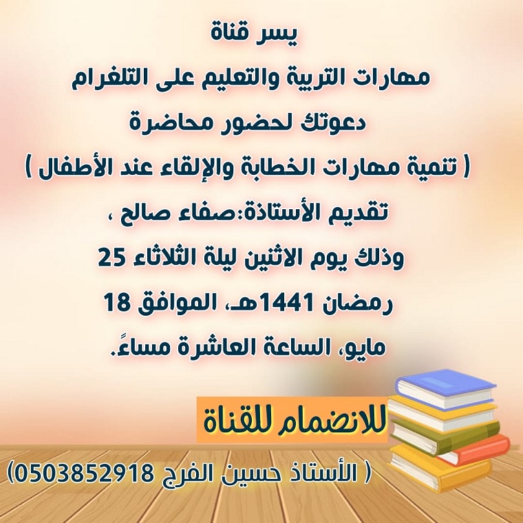 تنظم قناة مهارات التربية والتعليم على التليغرام محاضرة «تنمية مهارات الخطابة والإلقاء عند الأطفال» مع الأستاذة صفاء صالح يوم الأثنين.