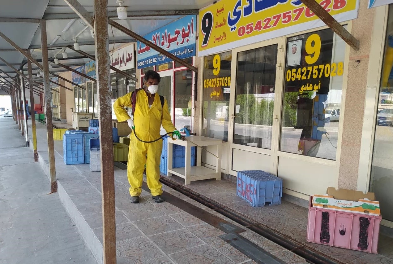 بلدية القطيف تعقم أسواق النفع العام أثناء فترة منع التجول الكلي