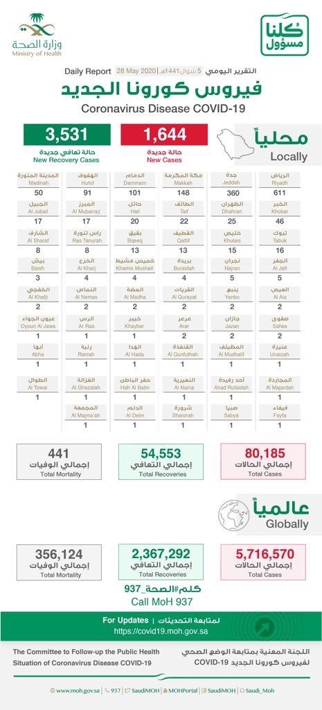 وتم تسجيل 3531 حالة تعافٍ جديدة منها 32 في القطيف و2 بصفوى، لترتفع الحالات الإجمالية للتعافي إلى 54553 حالة (68 % من إجمالي الإصابات المسجلة).