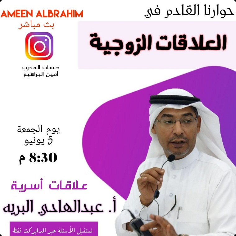 يستضيف المدرب أمين البراهيم عبر حسابه بالانستجرام، عبدالهادي البريه لمحاورته حول «العلاقات الزوجية».