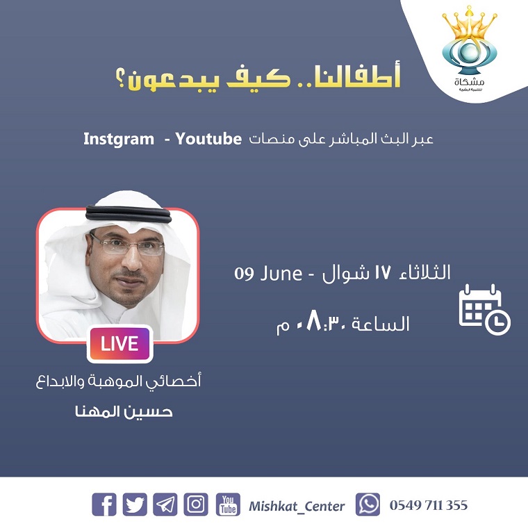 ينظم مركز مشكاة للتنمية البشرية محاضرة «أطفالنا.. كيف يبدعون؟» مع أخصائي الموهبة والإبداع حسين المهنا عبر البث المباشر على منصات youtube - Instagram.