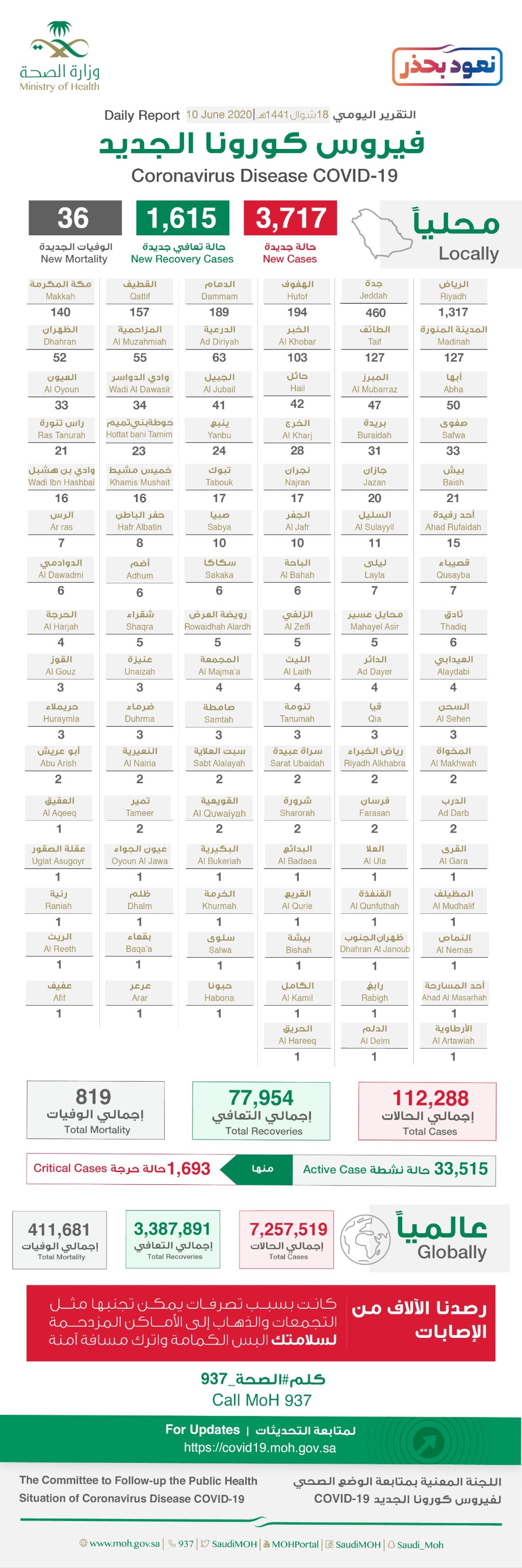 أعلنت وزارة الصحة، اليوم الاربعاء، تسجيل 3717 إصابة جديدة بفيروس ”كورونا“ المستجد ”كوفيد - 19“ في المملكة. منها 157 في القطيف و33 بصفوى.