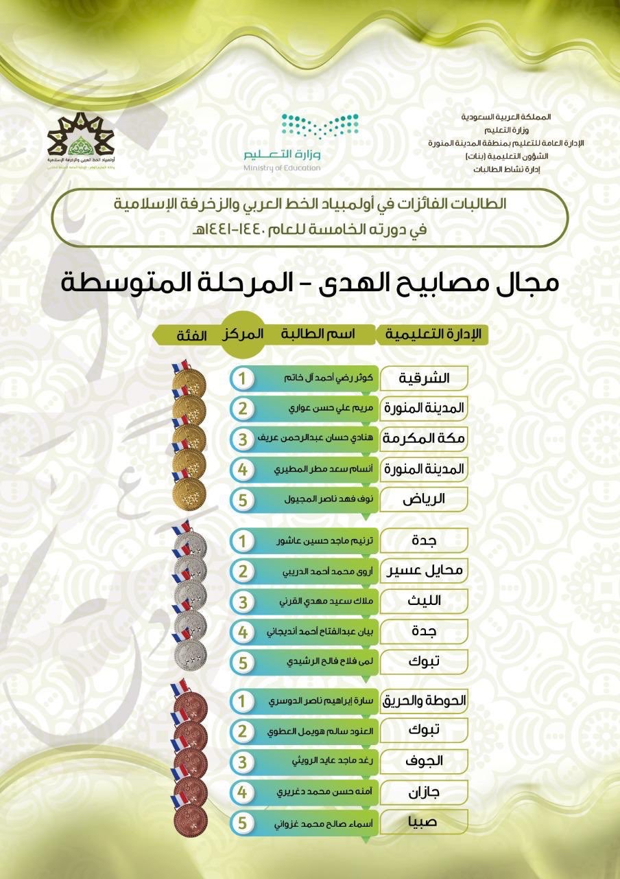 وكانت الطالبة المتميزة كوثر آل خاتم قد حققت المركز الثاني في الفئة الفضية على مستوى المملكة في المسار العلمي بمنافسات «أولمبياد الخط العربي والزخرفة الإسلامية» في دورته الثالثة للعام الدراسي 1438 / 1439 والذي استضافته الإدارة العامة للتعليم بمنطقة مكة المكرمة، واختتمت فعالياته يوم الخميس 27/ 6 / 1439.