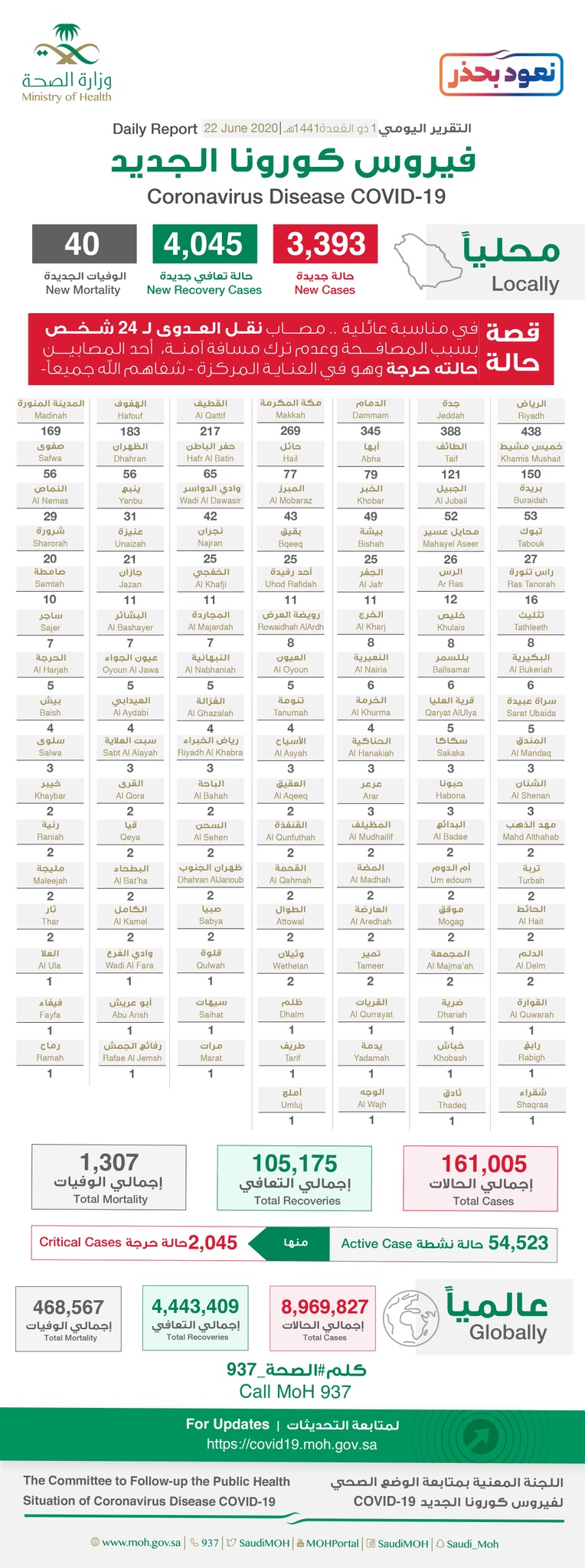 أعلنت وزارة الصحة، اليوم الاثنين، تسجيل 3393 إصابة جديدة بفيروس ”كورونا“ المستجد ”كوفيد - 19“ في المملكة. منها 217 في القطيف و56 في صفوى وحالة بسيهات.