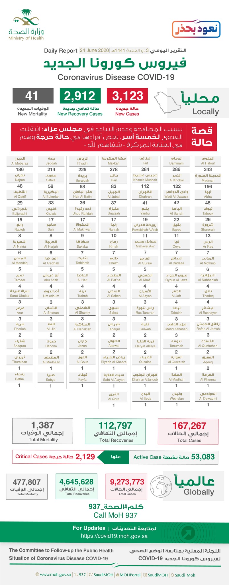 أعلنت وزارة الصحة، اليوم الاربعاء، تسجيل 3123 إصابة جديدة بفيروس ”كورونا“ المستجد ”كوفيد - 19“ في المملكة. منها 29 في القطيف و58 في صفوى.