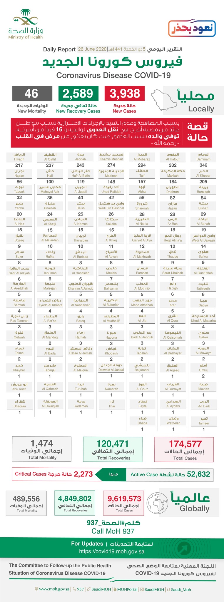 وأعلنت الوزارة تسجيل 46 حالة وفاة جديدة منها واحدة في القطيف، ليصل عدد الوفيات الكلي إلى 1474 حالة وفاة.