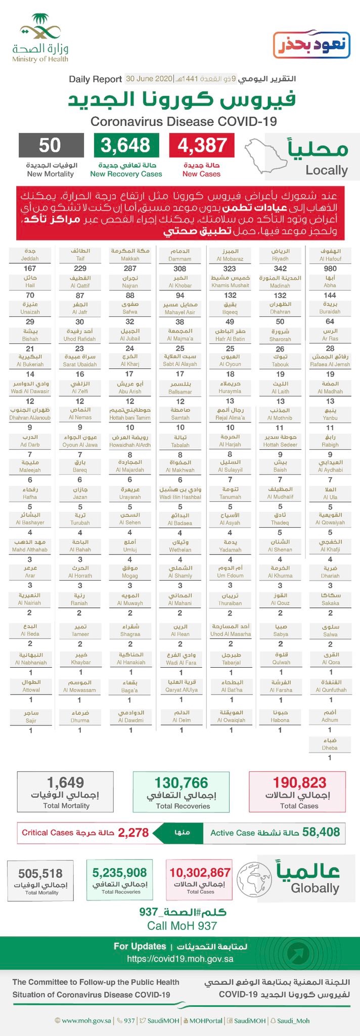 أعلنت وزارة الصحة، اليوم الثلاثاء، تسجيل 4387 إصابة جديدة بفيروس ”كورونا“ المستجد ”كوفيد - 19“ في المملكة. منها 87 في القطيف و32في صفوى.