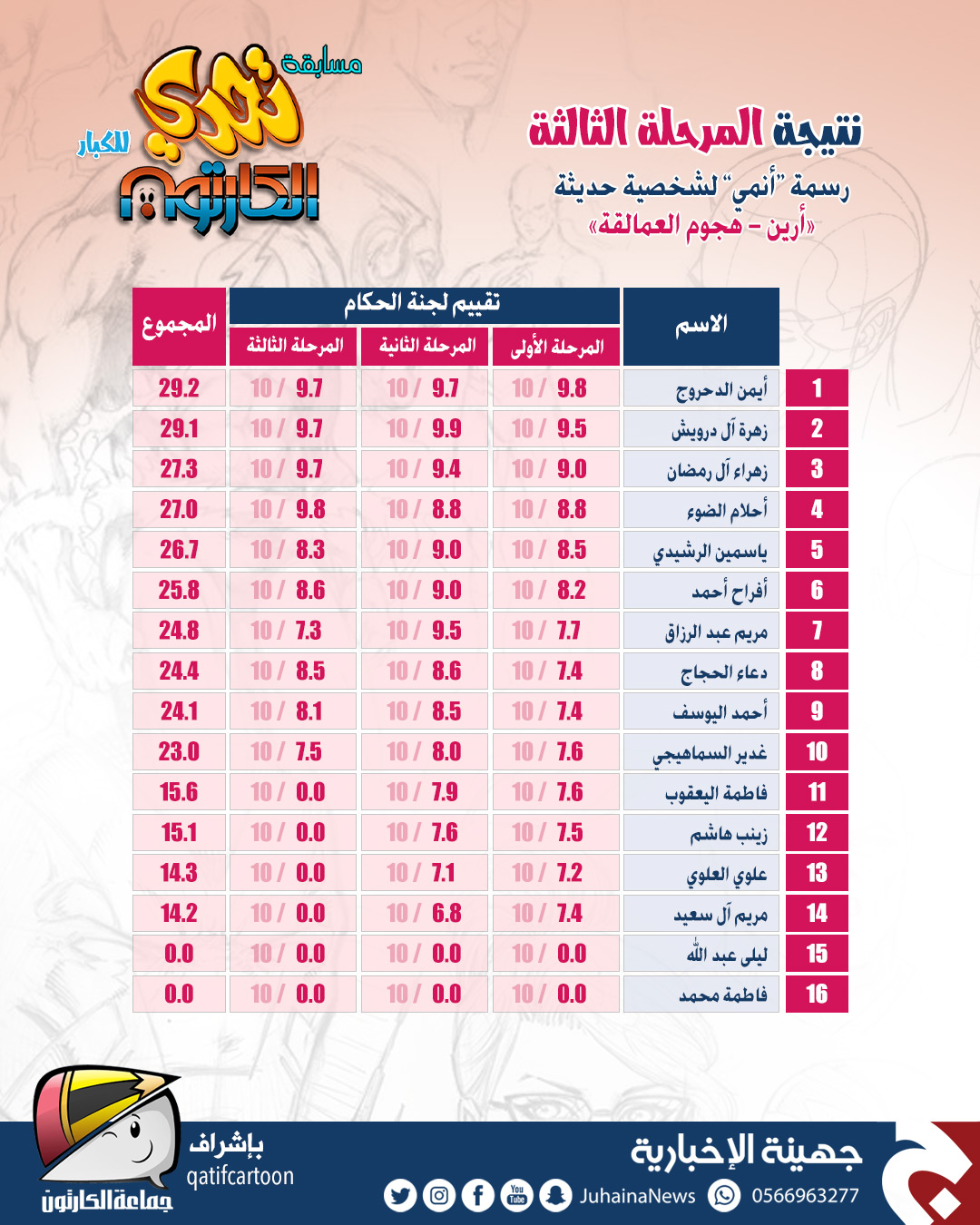وحقق الدحروج المركز الأول في المسابقة، في حين كان المركز الثاني من نصيب المتسابقة زهراء آل درويش، واحتلّت المركز الثالث المتسابقة زهراء آل رمضان.