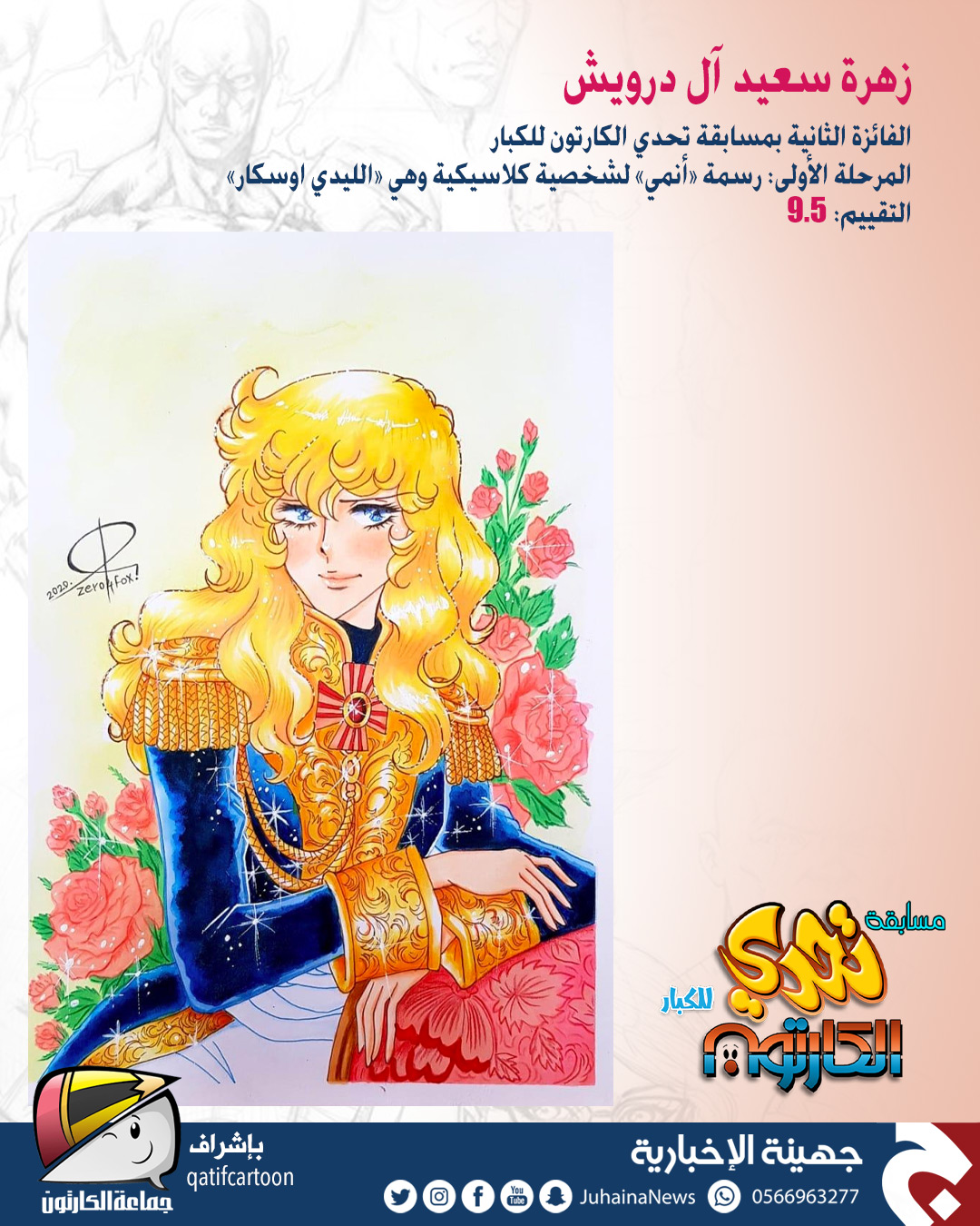 حقّق المتسابق أيمن الدحروج المركز الأول في مسابقة ”تحدي الكارتون“ للكبار التي نظمتها صحيفة جهينة الإخبارية بإشراف جماعة الكارتون.