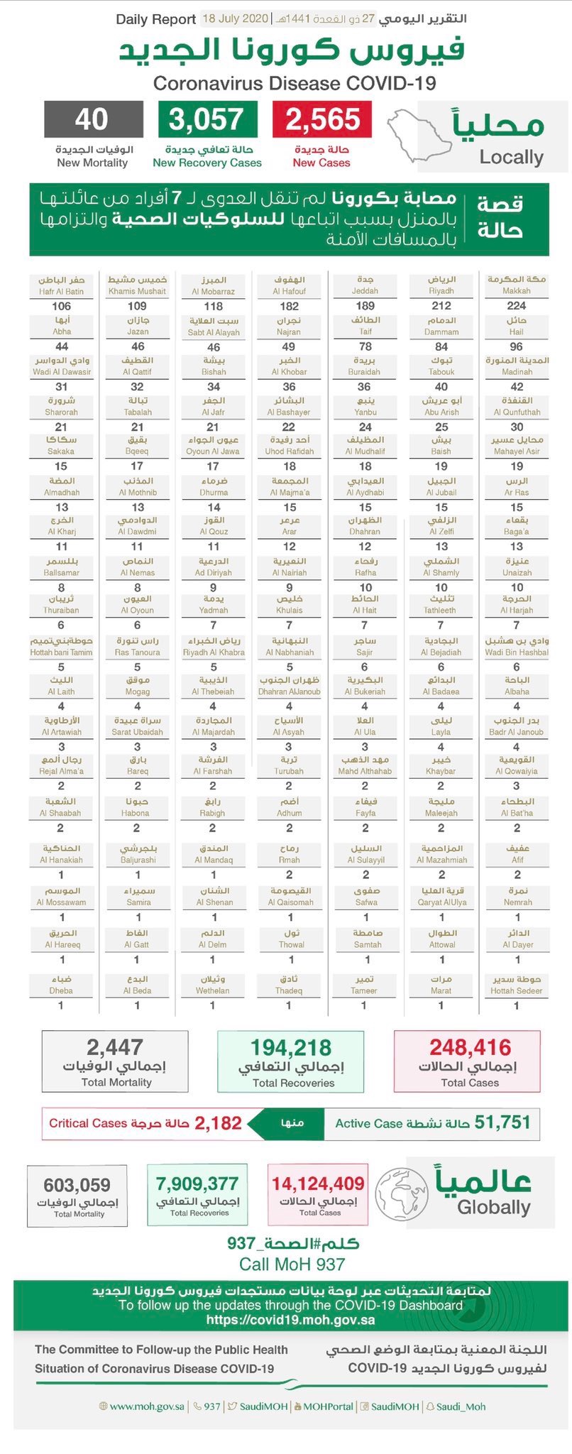 أعلنت وزارة الصحة، اليوم السبت، تسجيل 2565 إصابة جديدة بفيروس ”كورونا“ المستجد ”كوفيد - 19“ في المملكة. منها 32 في القطيف و1 في صفوى..