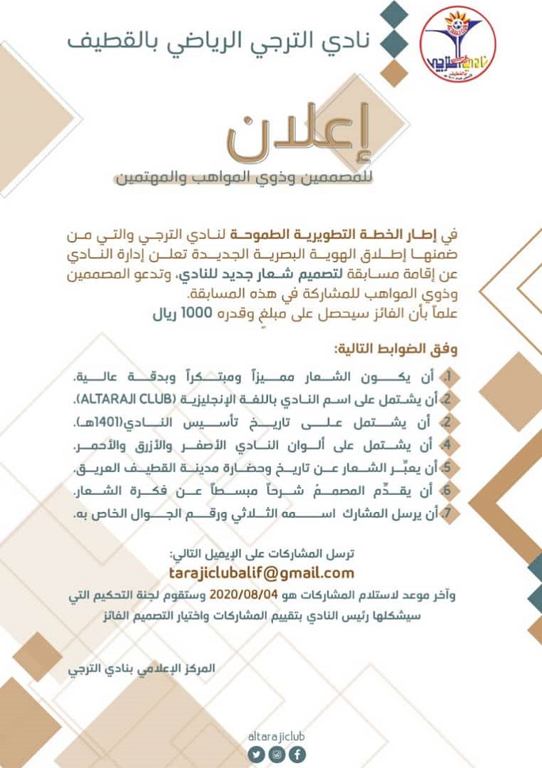 ودعا مجلس الإدارة المصممين والمواهب للمشاركة في المسابقة لتصميم شعار جديد للنادي حيث وضعت جائزة مالية للفائز الأول مقدارها 1000 ريال.