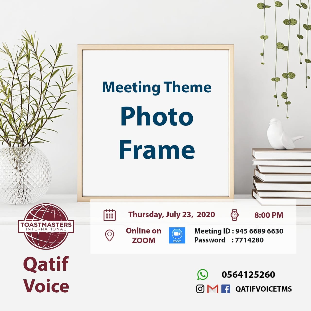 يقيم نادي صوت القطيف توستماسترز اجتماعه ”18” تحت شعار ”إطار الصورة“ والذي يهدف لوصول الشخص لأبهى صورة أمام الآخرين والتأثير فيهم بإيجابية، ضمن لقاء تعليمي وتطويري عن طريق منصة زووم للاجتماعات عن بعد.