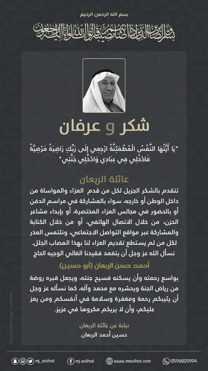 انتقل إلى رحمة الله تعالى الحاج أحمد حسن أحمد الربعان «أبو حسين»، من أهالي سيهات.