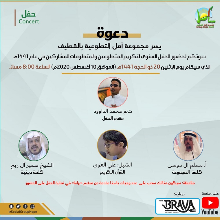 تنظم مجموعة أمل التطوعية بالقطيف الحفل السنوي لتكريم المتطوعين والمتطوعات المشاركين في عام 1441 هـ والذي سيقام يوم الأثنين على منصة اليوتيوب.