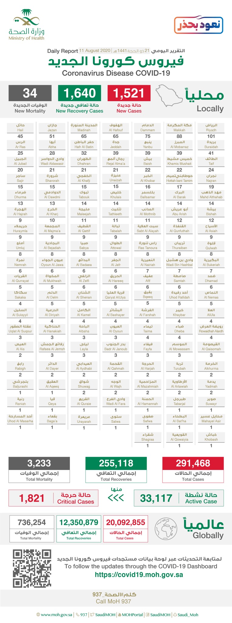 وبينت ان عدد الحالات المؤكدة في المملكة ”291,468“ حالة، من بينها ”33,117“ حالة نشطة لاتزال تتلقى الرعاية الطبية، ومعظمهم حالتهم الصحية مطمئنة، منها ”1,821“ حالة حرجة.