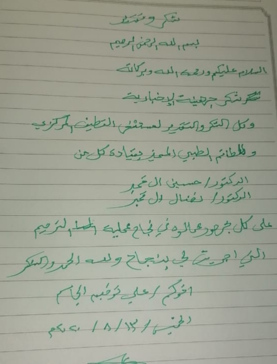 وبين خروجه على مسؤوليته من المستشفى بعد طلب ابن أخيه والدكتور آل قمبر وذلك بعد محاولته إيجاد دكتور تجميل في المستشفى الخاص ولم يصل لأي نتيجة.