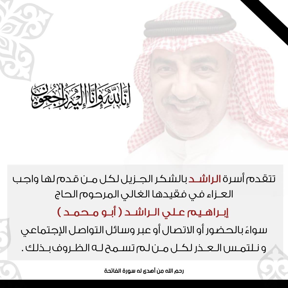 الفقيد السعيد الحاج أبو محمد، موظف متقاعد من شركة ارامكو السعودية، خادم أهل البيت، قائم على مأتم الزهراء «قبو الراشد» بسنابس. والد غدير الراشد، حرم سلمان الحبيب، رئيس المركز الإعلامي بنادي النور وجمعية البر الخيرية بسنابس. شقيق حسين الراشد، القائم على مسجد شيخ محمد بسنابس. واجه الفقيد متاعب صحية مؤخرا، ودخل المستشفى لتلقي العلاج منذ 23 يوما إلى أن اختاره الله الى جواره.
