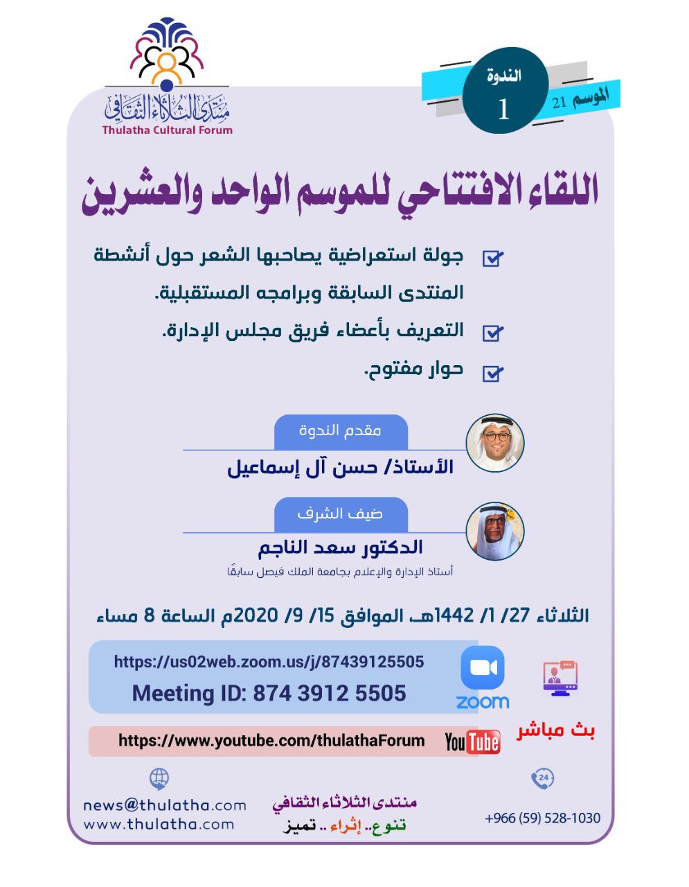 ويحل الدكتور سعد الناجم، استاذ الإدارة والإعلام بجامعة الملك فيصل ضيف شرف في الأمسية التي تختتم بحوار تفاعلي مباشر على قناة ”زووم“