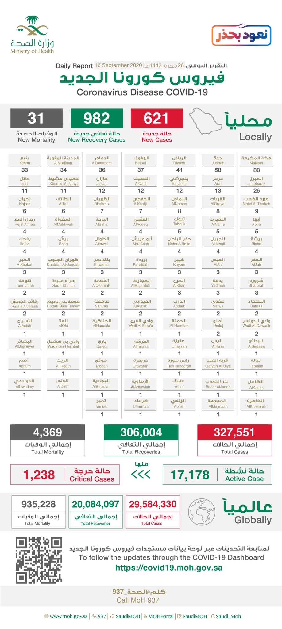 أعلنت وزارة الصحة اليوم ”الاربعاء“ تسجيل 621 إصابة جديدة بفايروس كورونا المستجد المسبب لمرض ”كوفيد19“. منها 12 في القطيف و2 بصفوى. ليرتفع إجمالي الإصابات في المملكة إلى 327551 حالة مؤكدة.