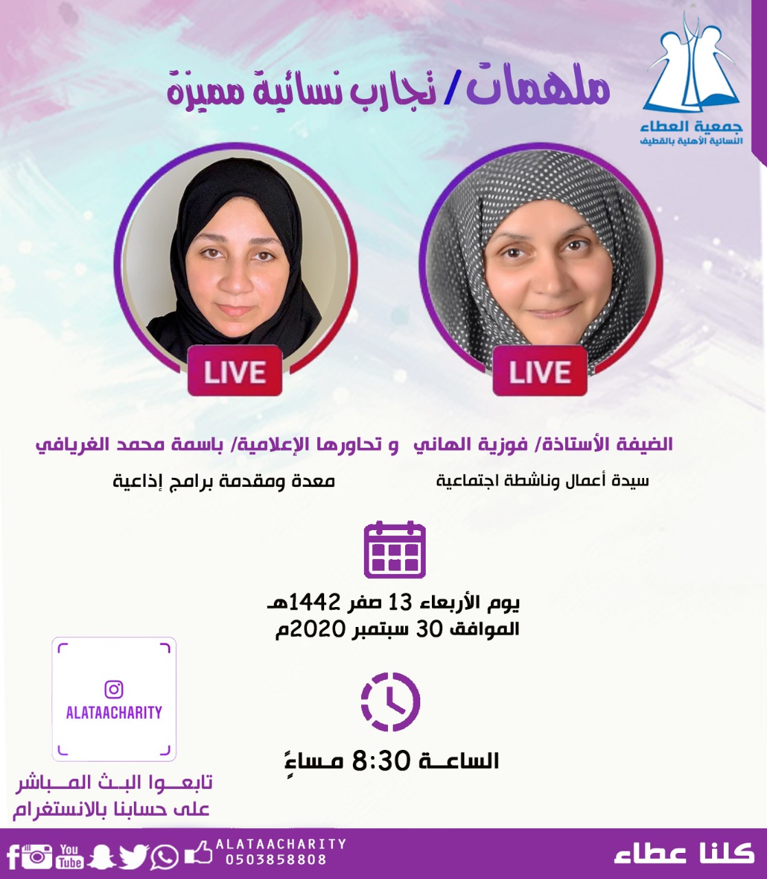 تستضيف جمعية العطاء النسائية بالقطيف سيدة الأعمال والناشطة فوزية الهاني ضمن برنامج ”ملهمات.. تجارب نسائية مميزة“ وتحاورها الإعلامية باسمة الغريافي.