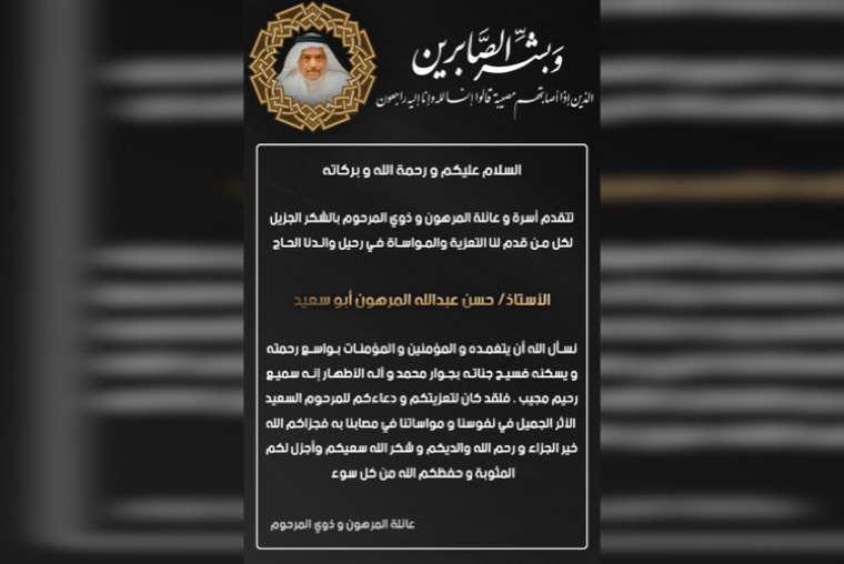 انتقل إلى رحمة الله تعالى الحاج حسن عبدالله حسين المرهون «أبو سعيد»، من أهالي سيهات «حي المحدود»، عن عمر ناهز 80 عاماً.